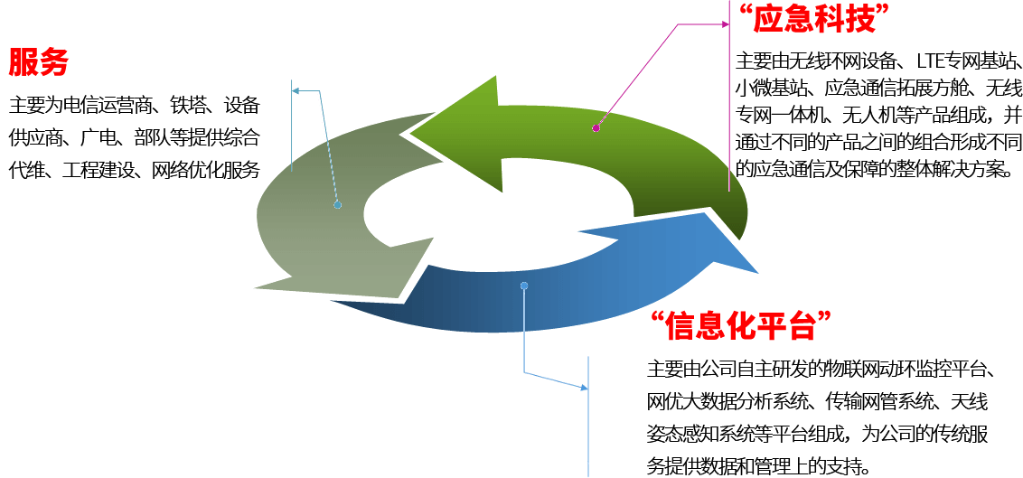 公司在传统的“建”与“维”的基础上,嵌入自主研发的具有可实现应对重大通信保障活动、防抗自然灾害应急通信手段,以及提供运营系统平台功能的配套特色服务,不断提升应急通信网络保障质量;形成安博电竞区 别于其他通信服务商的两大特色服务即“服务+应急科技”、“服务+信息化平台”。